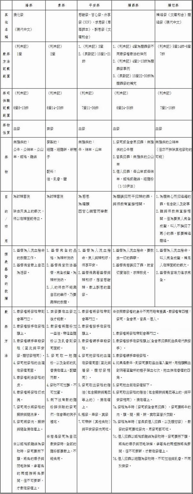 若依照次序來講就是:燔祭、素祭、平安祭、贖罪祭以及贖愆祭。